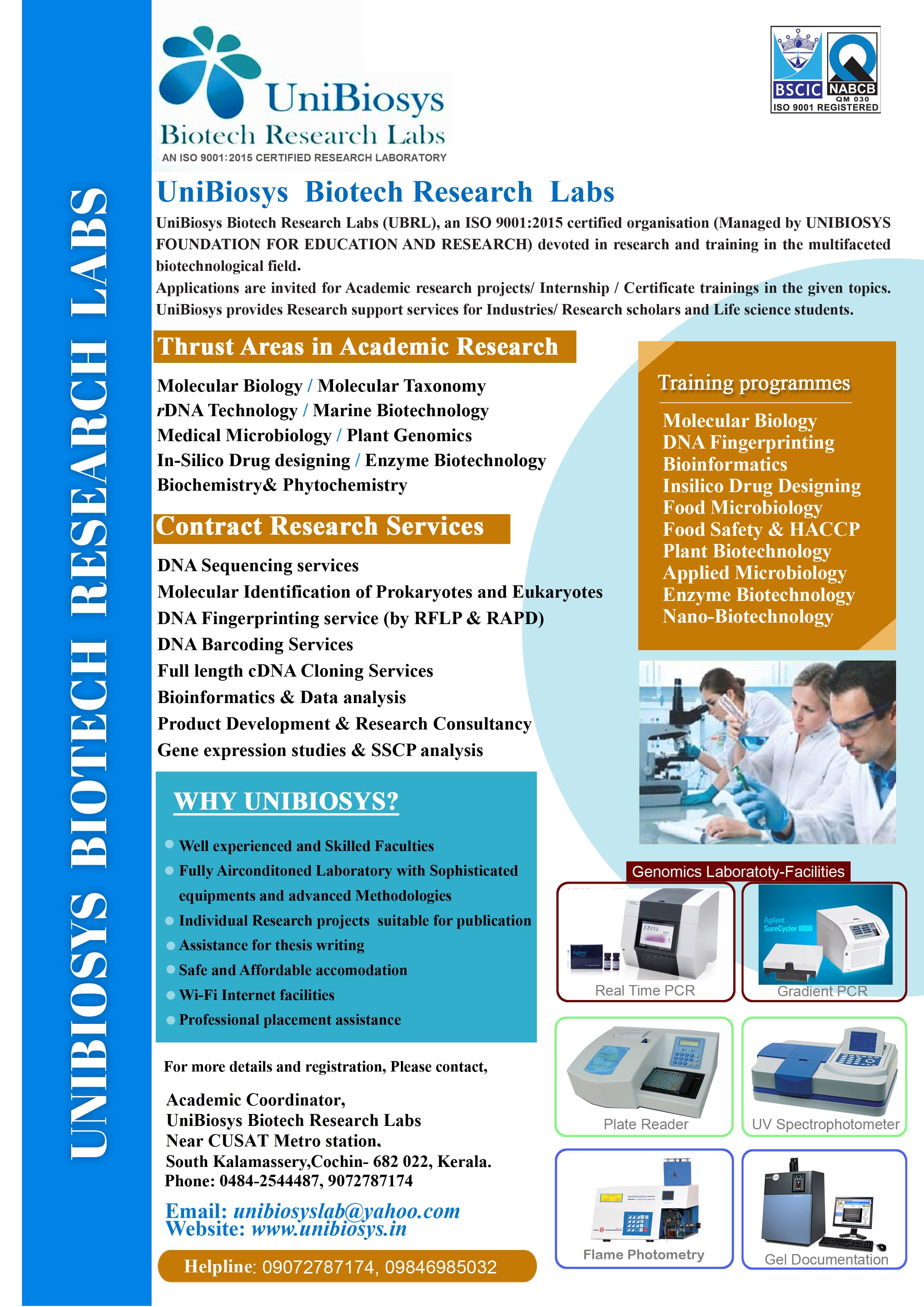 UniBiosys Biotech Research Lab has designed and developed the Thesis and Dissertation Programmes using our vast resources and experience in Biotechnology and allied fields. Our Thesis and Dissertation Programme aims to provide technique rich, hands-on training for students, helping them to apply a wide variety of advanced techniques in problem solving exercises. UniBiosys with its good technology combined with quality, helps students to understand the corporate culture and importance of working in a team. We also provide excellent faculty and guidance, reference materials, E- library, E- publications and internet facility to students for the smooth conduct of their research project work. UniBiosys provide support to researchers and life science students to publish their research work in renowned scientific journals.